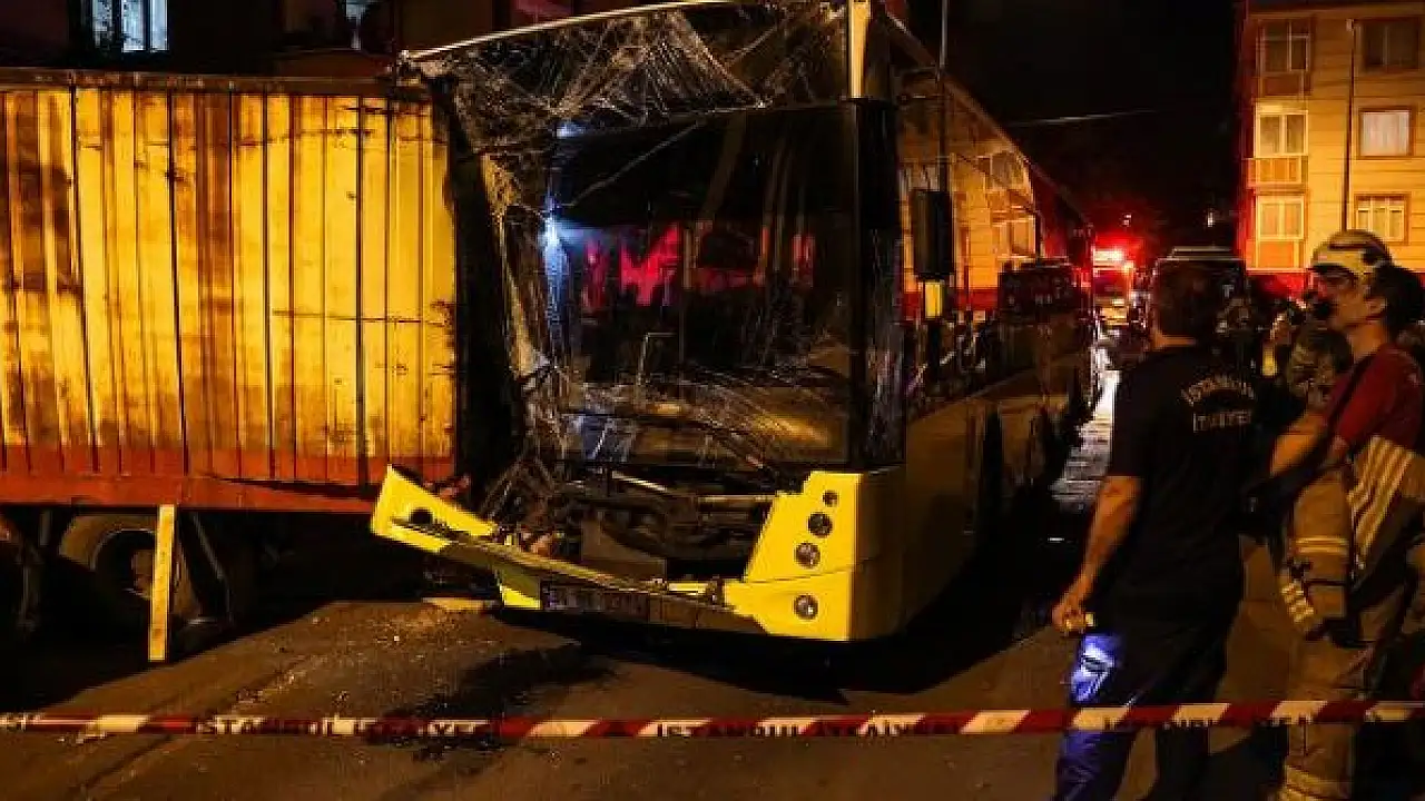 İETT otobüsü kamyona çarptıktan sonra dururken, kimliği belirlenemeyen sürücü olay yerinden kaçtı.
