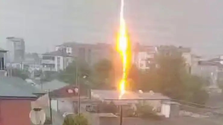 Iğdır, iki günden beri yağmurlu bir havanın etkisi altında. Bugün de kapalı havayla uyanan kentte yağmur öncesi Emek Mahallesi'nde bir kişi; evinin penceresinden cep telefonuyla görüntü alırken birden karşıdaki tek katlı, bahçeli eve yıldırım düştü. Alevlerden korkan vatandaşın bağırarak cep telefonunu bırakması görüntülere yansıdı.