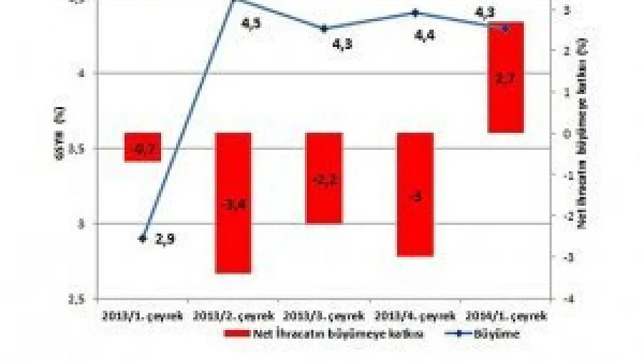 Net ihracatın yılın ilk çeyreğinde büyümeye katkısı yüzde 2,7 oldu. Net ihracat 2013 yılında çeyrek bazında sırasıyla yüzde 0,7, 3,4, 2,2 ve 3 düzeyinde büyümeye negatif katkı sağlamıştı.