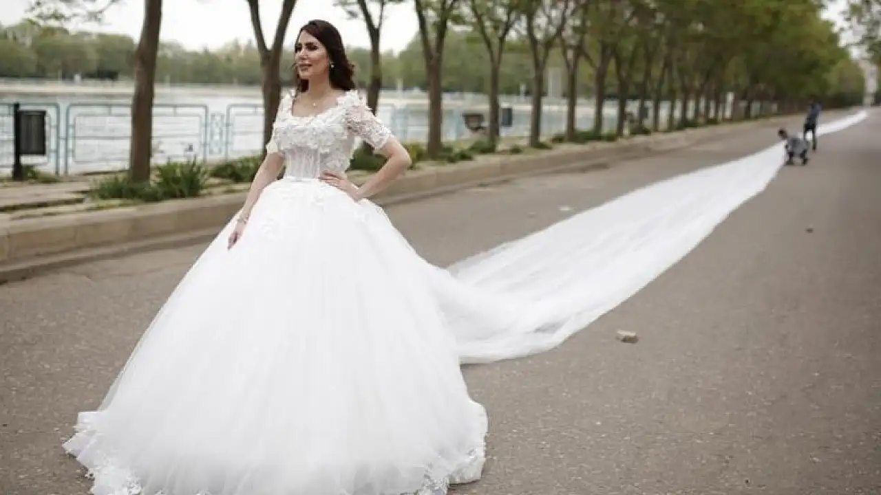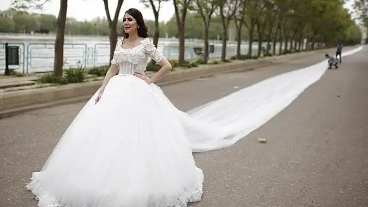 Irak Kürt Bölgesel Yönetimi'nin Erbil kentinde bir modacı tarafından 600 metre kumaş kullanılarak 200 metre uzunluğunda gelinlik dikildi.