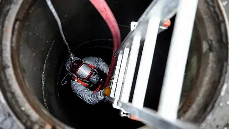 Gaz maskesini takan Aras, daha sonra merdiven yardımıyla girdiği kanalda tıkanıklığa neden olan maddeleri çıkarıyor. Aras'ı bu aşamada yukarıda bekleyen mesai arkadaşları an be an kontrol ediyor.
