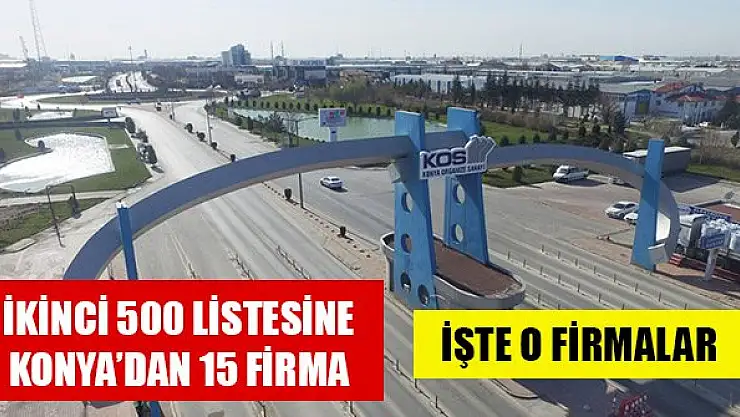 Türkiye'nin İkinci Büyük Sanayi Kuruluşu listesine Konya'dan 15 firma girdi. İkinci 500 Büyük Sanayi Kuruluşu listesinde yer alan Konyalı firmalar şöyle sıralandı: Hekimoğlu Un, RTM Tarım, Kombassan Kağıt, Akova Süt, Ömer Atiker Makine, Tümosan Motor, Büyük Hekimoğulları Gıda, İzi Süt, Altınapa Değirmencilik, Çöğenler Yemcilik, Yıldız Pul, Konya Çimento, Sezersan Matbaacılık, Helvacızade Gıda, Kompen PVC.
