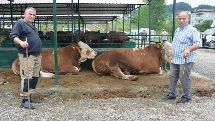 Ordu'nun Ünye ilçesinde yaklaşan Kurban Bayramı öncesi kurbanlıklar hayvan pazarında müşterilerini beklerken, pazarda bulunan iki boğa ise ikinci el otomobil fiyatına satılıyor.