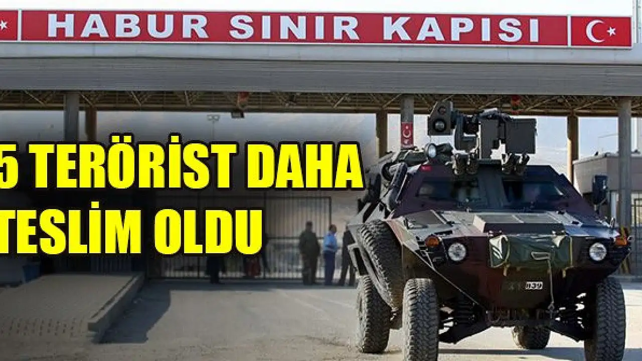 Bakanlıktan yapılan açıklamaya göre, Emniyet Genel Müdürlüğünün ikna çalışmaları sonucu, biri terörden arananlar listesinde 500 bin liraya kadar ödülle gri kategoride aranan 5 terörist, Şırnak Habur Sınır Kapısı'nda güvenlik güçlerine teslim oldu.