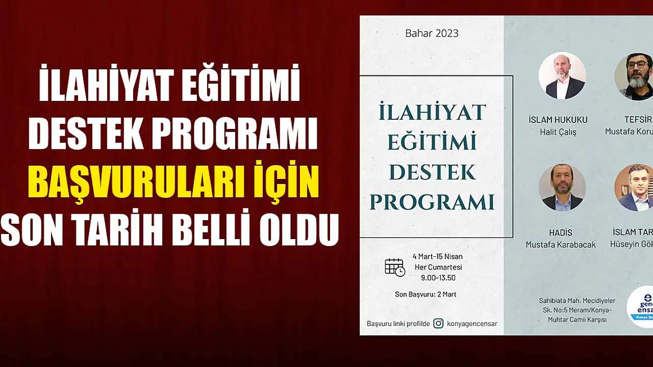 4 Mart 15 Nisan tarihleri arasında devam edecek olan İlahiyat eğitimi destek programına İslam Hukuku dersi için Prof. Dr. Halit Çalış, Tefsir dersi için Mustafa Koruyucu, Hadis dersi için Doç. Dr. Mustafa Karabacak ve İslam tarihi dersi için Doç. Dr. Hüseyin Gökalp eğitim verecek. Eğitimler her Cumartesi sabah 09.00'da başlayacak ve 13.50'de bitecek. İlahiyat Eğitimi Destek Programına son başvurusu 2 Mart olarak bildirildi.
