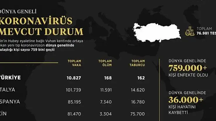 İletişim Başkanlığın Twitter hesabından yapılan paylaşımda, Çin'in Hubey eyaletine bağlı Vuhan kentinde ortaya çıkan Kovid-19'un dünya genelinde bulaştığı kişi sayısının 759 bini geçtiği, 36 binden fazla kişinin hayatını kaybettiği, 158 bin 700'den fazla kişinin de iyileştiği belirtildi.