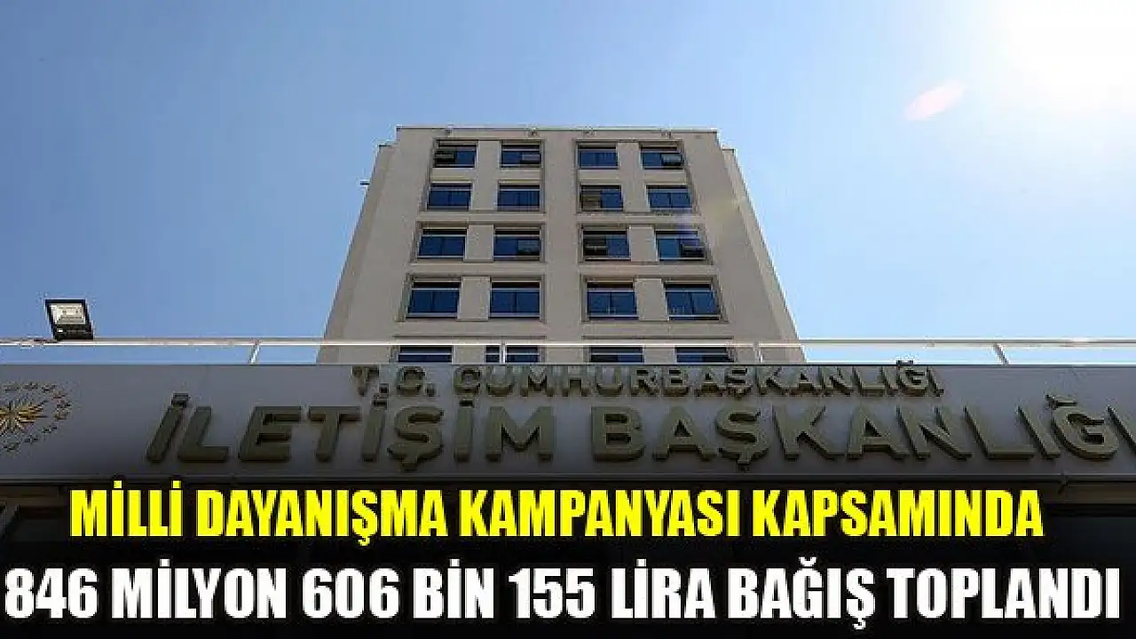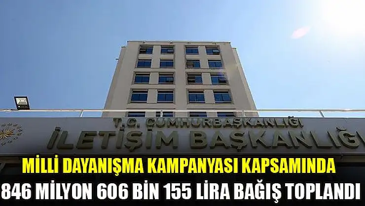 İletişim Başkanlığından, Milli Dayanışma Kampanyası kapsamında şu ana kadar 846 milyon 606 bin 155 lira toplandığı bildirildi.