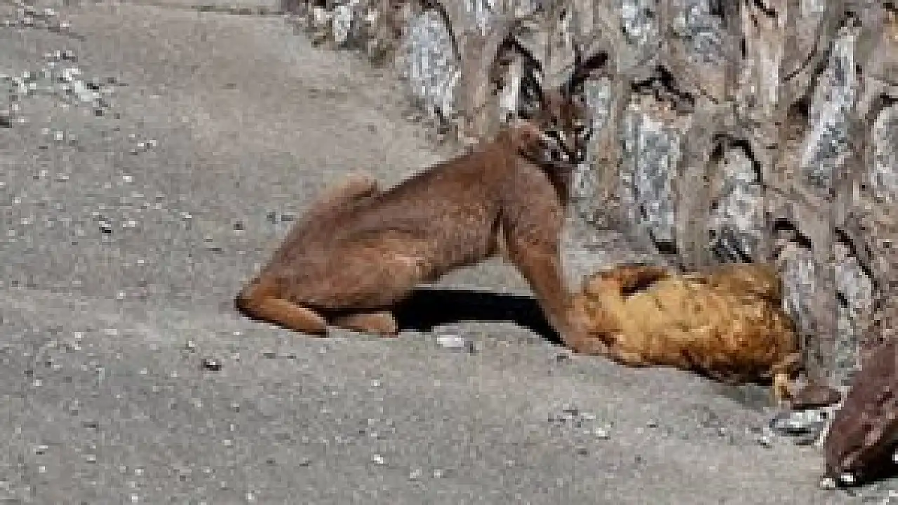 Muğla Marmaris'te, dış görünümü ile vaşağa çok benzeyen, hatta ‘Step vaşağı', ‘Mısır vaşağı' gibi adlarla da anılan vahşi kedi türü olan karakulak, güpegündüz görüntülendi. Hem de tavuk yerken.
