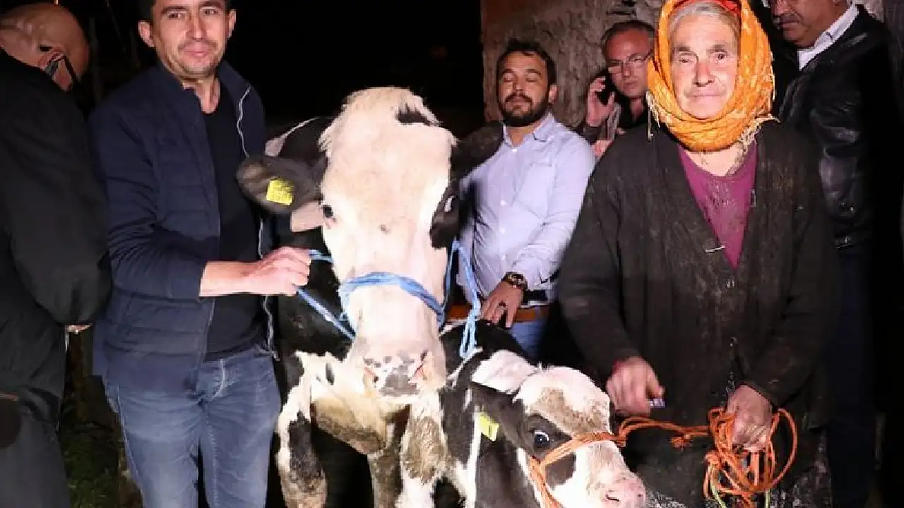 Denizli'de kayalıktan düşen ineği için gözyaşı döktüğü görüntüleri sosyal medyada ilgi gören 70 yaşındaki kadına Tarım ve Orman Bakanı Bekir Pakdemirli, buzağılı inek hediye etti.