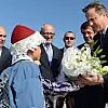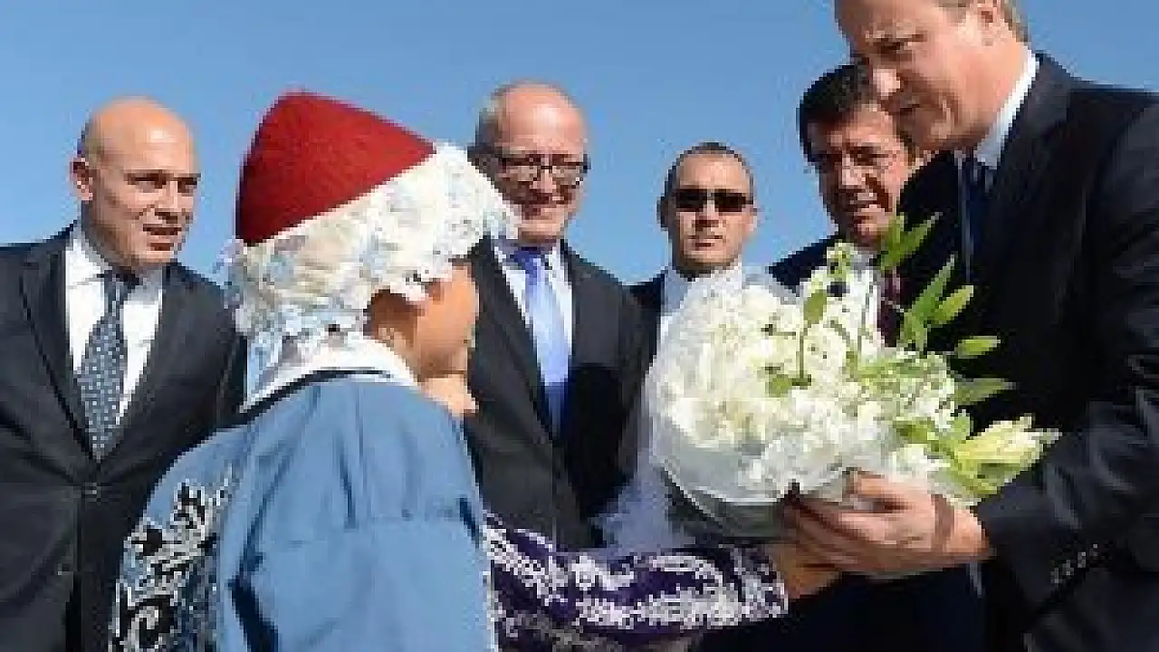 Karşılama töreninde Cameron'a yöresel elbise giyen iki çocuk, çiçek takdim etti.