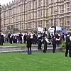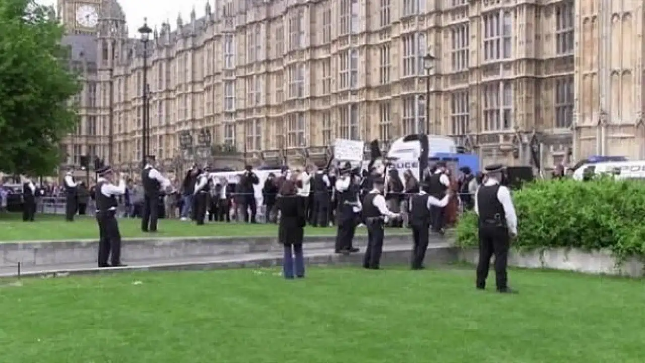 İngiliz polisi gösteri sırasında parlamento önündeki güvenlik önlemlerini arttırdı. Grubun önünde adeta etten duvar ören polisle göstericiler arasında sözlü sataşmalar gece boyunca devam etti.