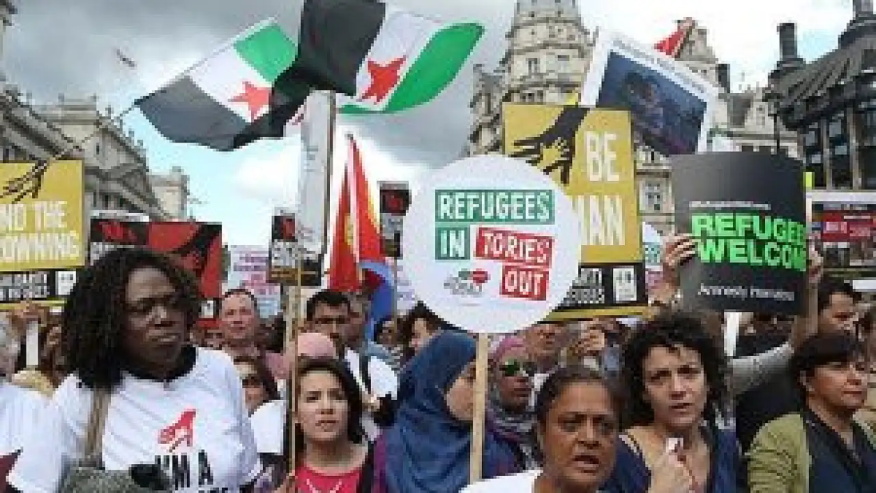 Kentin Hyde Park Corner mevkisinden Parlamento Meydanı’na uzanan 3 kilometrelik güzergahta yürüyen on binlerce kişi, sığınmacılarla dayanışmayı ifade eden pankart ve dövizler taşıdı.