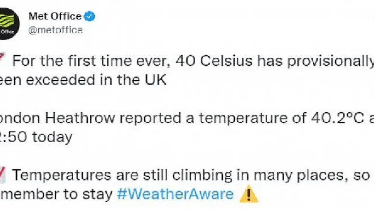 İngiltere Meteoroloji Ofisi (Met Office), ülke tarihinde ilk kez hava sıcaklığının 40 dereceyi geçtiğini duyurdu.
