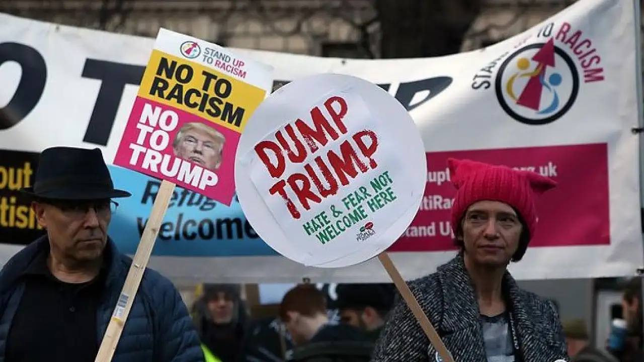 ABD Başkanı Trump'ın, 7 İslam ülkesinin vatandaşlarının ABD’ye girişini yasaklaması ile Meksika sınırına duvar inşası gibi politikalarının protesto edildiği ve İngiltere Başbakanı Theresa May'in Trump'ın politikalarına net tepki vermediği için eleştirildiği etkinlikte katılımcılar, "Trump'ı burada istemiyoruz" ve "Trump'a hayır" sloganları attı.