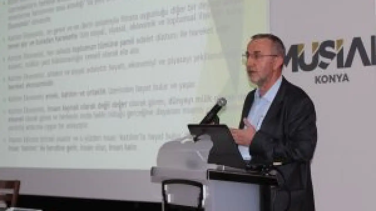 MÜSİAD Konya Şubesi Cuma Konferanslarının bu haftaki gündemi İktisatta Yeni Boyut, Katılım Ekonomisi ve İnsan Kıymetleri konusu oldu. Programa konuk olarak katılan Albaraka Türk Katılım Bankası Genel Müdür Yardımcısı Temel HAZIROĞLU katılımcılara katılım ekonomisi ve günümüz ekonomi sistemleri hakkında ayrıntılı bilgiler verdi.