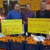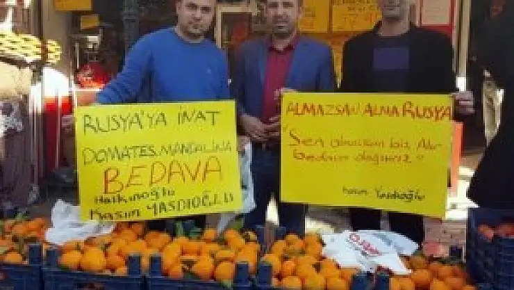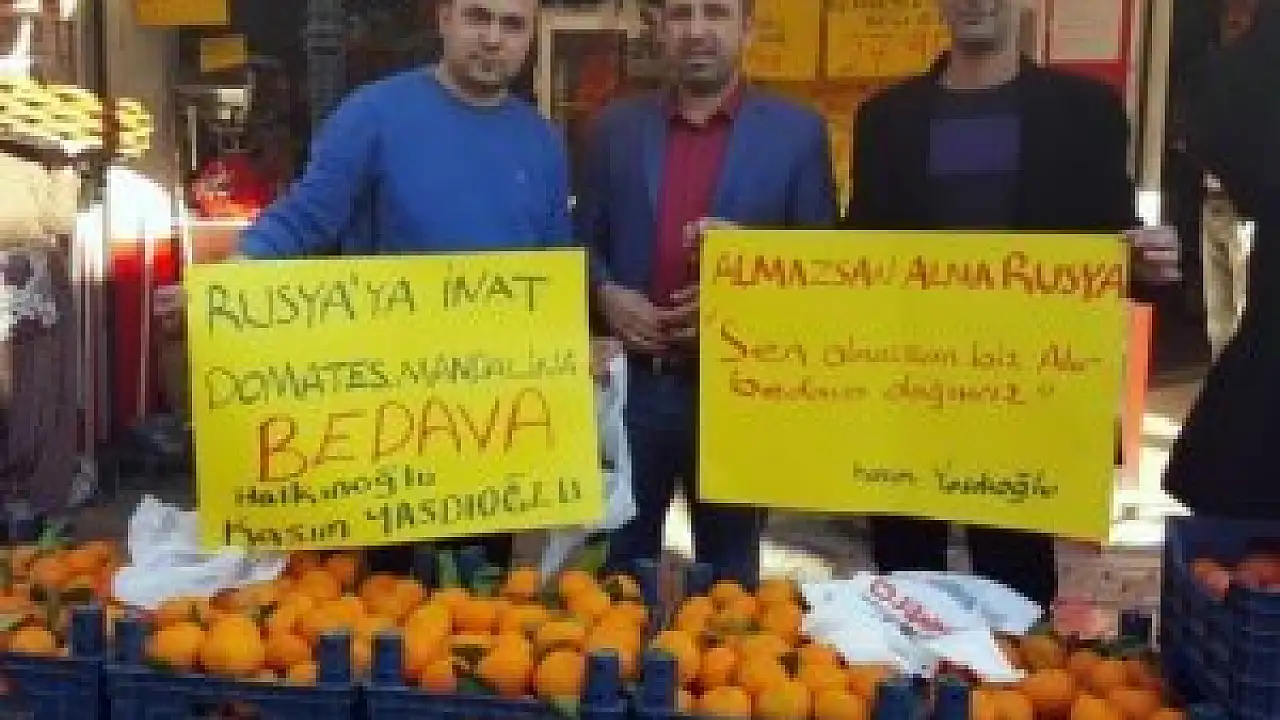 Üzerinde “Rusya’ya inat domates mandalina bedava” ve “Almazsan alma Rusya, sen almazsan biz alır bedava dağıtırız” şeklinde yazı bulunan pankartları gören vatandaşlar önce şaşırdı sonra mandalina ve domatesin bedava dağıtıldığını duyunca uzun kuyruklar oluşturdu.