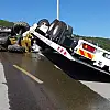 KOCAELİ'nin Körfez ilçesinde ağır tonajlı araçların girmesi yasak olan yola giren iş makinesi yüklü çekici, rampada freninin boşalması sonucu devrildi.