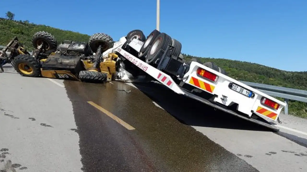 İş makinesi yüklü çekici devrildi, sürücü ilk iş annesini aradı