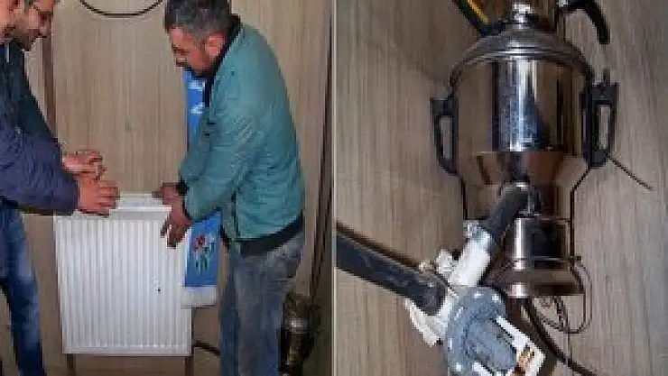 Tokat'ın Erbaa ilçesinde oto elektrik ustası Ferhat Şahin, iş yerini ısıtmak için elektrikli ısıtıcıdan memnun kalmayınca semaver ve kalorifer peteği kullanarak geliştirdiği 'semafer' adını verdiği sistemi kullanıyor.