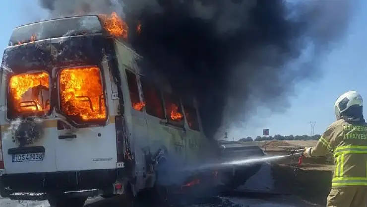 BALIKESİR'in Savaştepe ilçesinde, seyir halindeki işçi servis minibüsü çıkan yangında kullanılmaz hale geldi. Araçtan duman çıkmaya başlayınca minibüsü terk eden şoför ve 6 işçi yangından yara almadan kurtuldu.