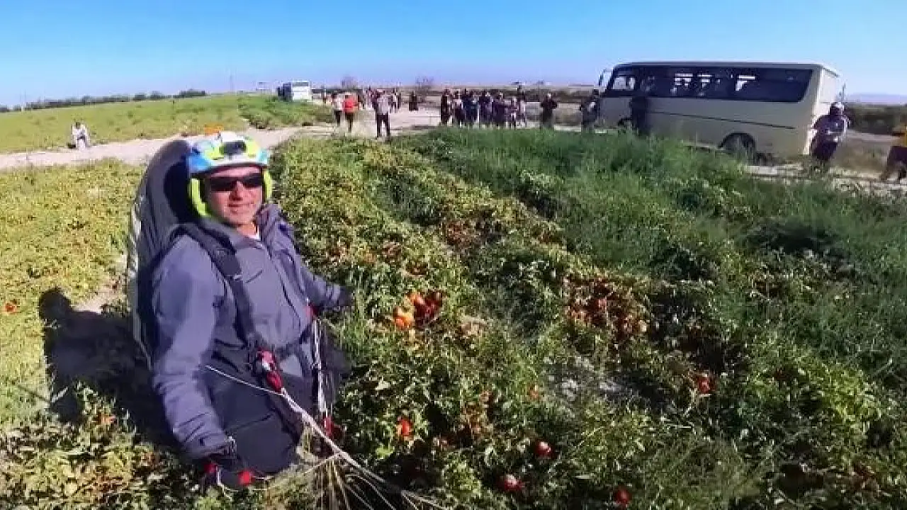 İşçilerin selamladığı yamaç paraşütü pilotu domates tarlasına indi
