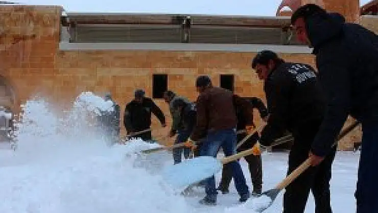 Bölgede önceki gün başlayan kar nedeniyle beyaz örtüyle kaplanan İshak Paşa Sarayı'nda, tarihi yapının zarar görmemesi ve ziyaretlerin aksamadan sürmesi için avluda biriken karlar, kar püskürtme makinesi ve görevlilerce küreklerle temizlendi.