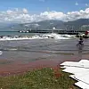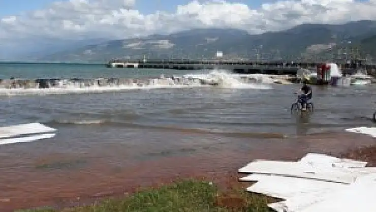 Dünden beri etkili olan yağmurun ardından sabah saatlerinde sahil kordonunda denizin taştığı, sahil kenarında bulunan park ve bahçelere su dolduğu görüldü. Deniz kenarında bulunan market ve büfelerin sandalye ve masaları su altında kaldı. İş yerleri sahipleri, eşyalarını sudan çıkarmaya çalıştı.