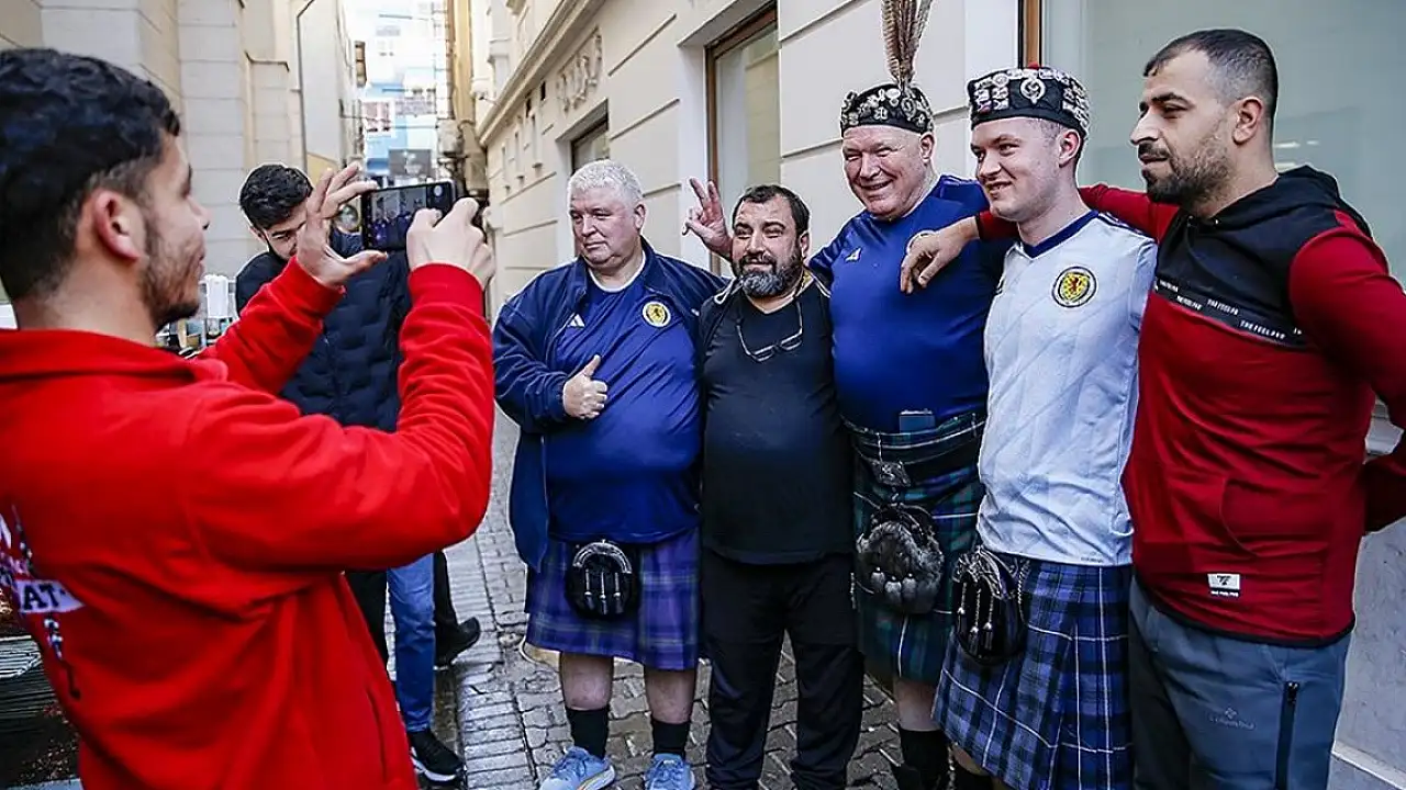 Tarihi Hasan Paşa Hanı'nda Türk kahvesi içen İskoç taraftarlar, daha sonra Tarihi Ulu Camii'ni gezdi. Esnaf ve vatandaşlar İskoç taraflarla fotoğraf çekti.