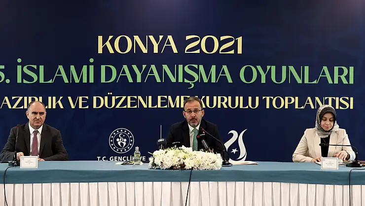 Gençlik ve Spor Bakanı Mehmet Muharrem Kasapoğlu, Bakanlıkta düzenlenen Konya 2021 5. İslami Dayanışma Oyunları Hazırlık ve Düzenleme Kurulu Toplantısı'nda konuştu. Konya 5. İslami Dayanışma Oyunları'nı, 19 spor, bir geleneksel gösteri ve 4 para spor branşı olmak üzere 24 branşta gerçekleştireceklerini söyleyen Kasapoğlu, 'Sadece Konya'mıza değil İslam alemine yaraşır bir şekilde mükemmel bir organizasyonu hep birlikte gerçekleştireceğiz' dedi.