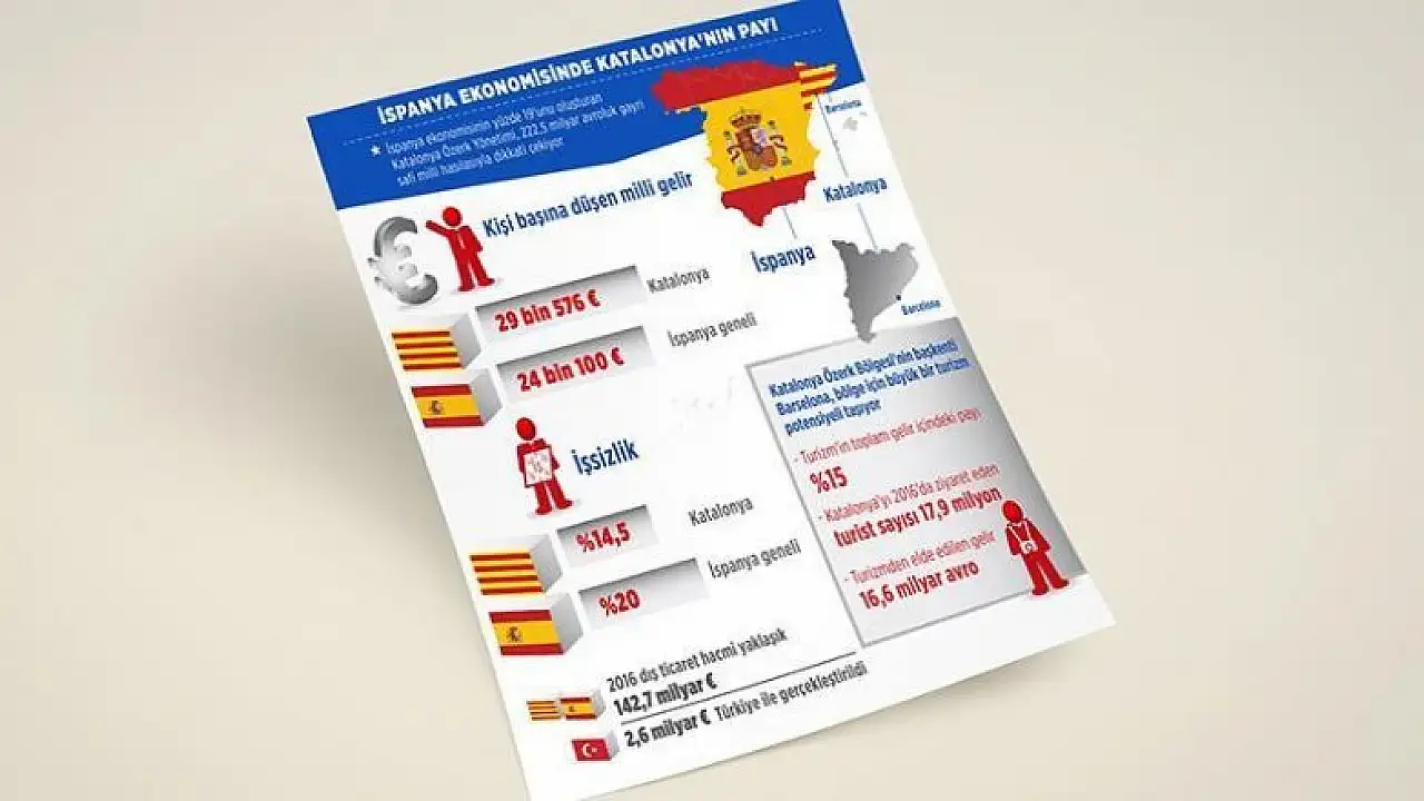 İspanya'da 7,5 milyonluk nüfusuyla toplam nüfusunun yüzde 16'sını oluşturan Katalonya'nın geçen yıl gayri safi milli hasılası yaklaşık 222,5 milyar avro seviyesinde gerçekleşti. Katalonya, geçen yıl elde ettiği 29 bin 576 avroluk kişi başına düşen milli gelirle, 24 bin 100 avro olan İspanya'nın kişi başına düşen milli gelirini geride bırakmayı başardı.