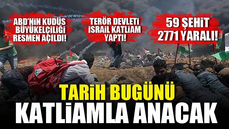 ABD'nin büyükelçiliğini Kudüs'e taşıma kararını Gazze sınırında protesto eden Filistinlilere İsrail askerlerinin açtığı ateş sonucu 59 Filistinli şehit oldu, 2 bin 771 Filistinli yaralandı.
