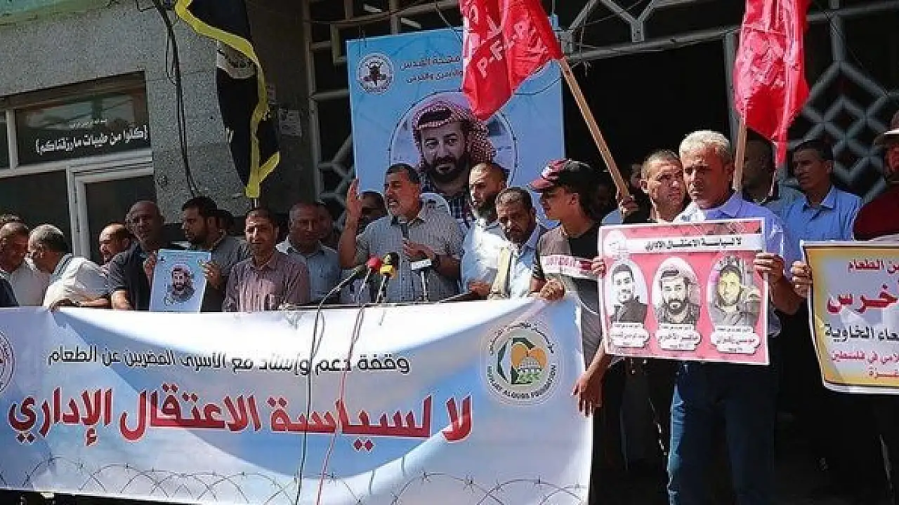 Filistin Halk Kurtuluş Cephesi (FHKC) ve bazı sivil toplum kuruluşlarının çağrısıyla düzenlenen gösteride, İsrail hapishanelerindeki Filistinli tutuklulara ve İsrail'in idari tutukluluk uygulamasını protesto için bir süredir açlık grevini sürdürenlere destek mesajları verildi.
