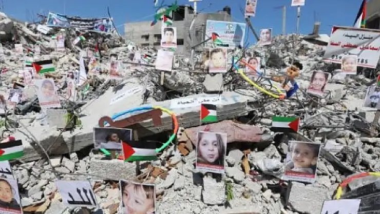 İsrail saldırılarında ölen çocukların fotoğrafları bir enkazda sergilendi