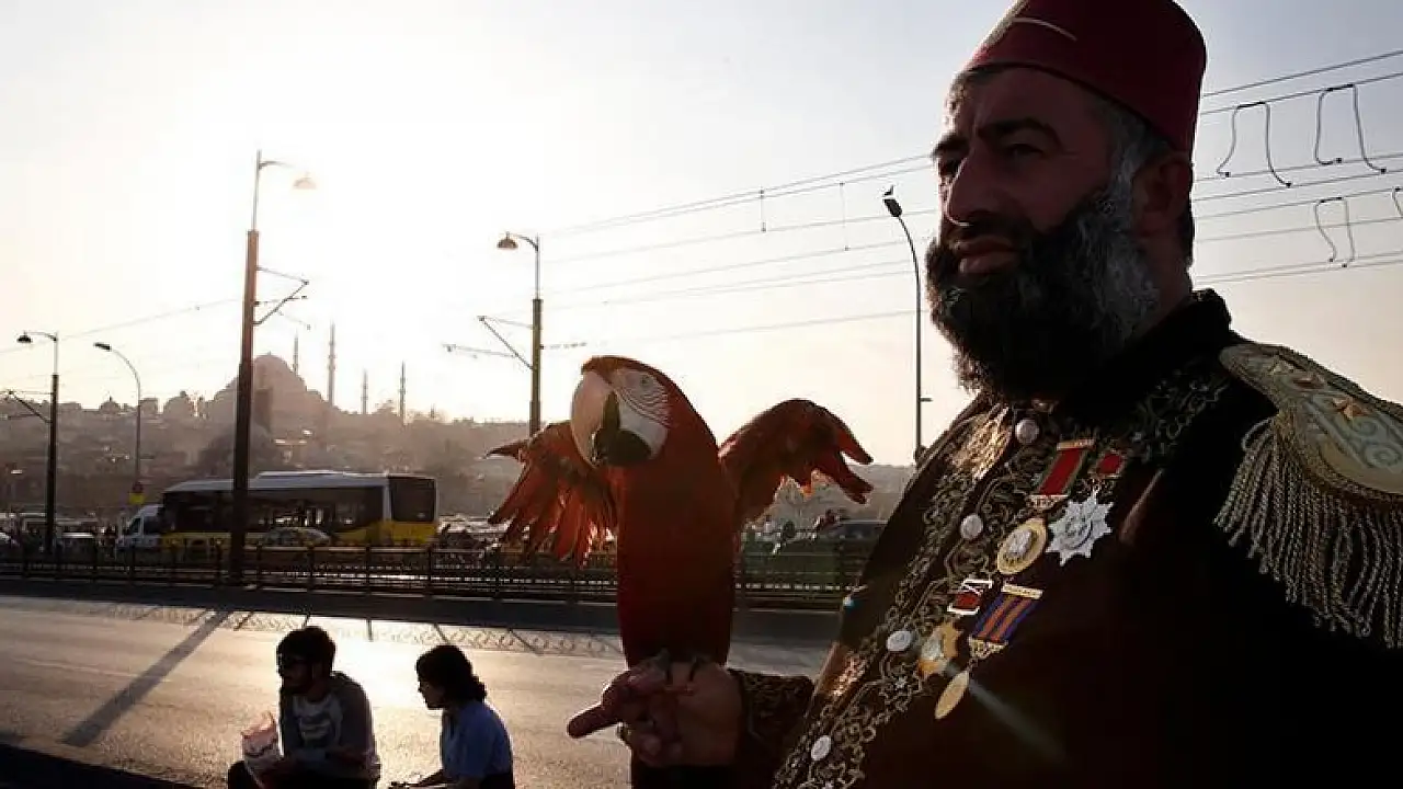 Dizilerde figüranlık yapan ve Osmanlı İmparatorluğu'na hayranlığından dolayı dönemin kıyafetleri giyen Nazım Cihan, 'Paşa' adındaki papağanıyla şehri arşınlıyor.