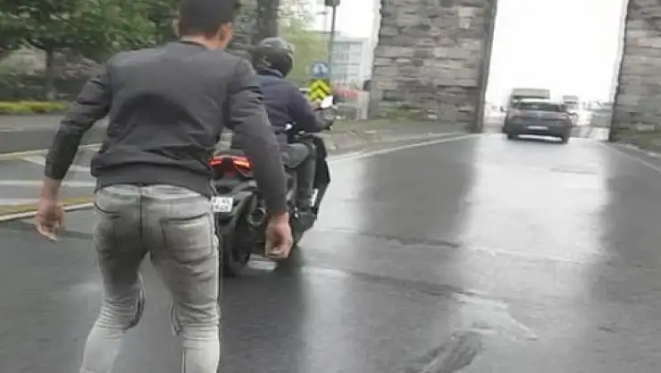 İstanbul Beyoğlu'ndan Fatih'e kadar 4'ü bir otobüsün arkasına 1'i bir motosikletin arkasına tutunarak yolculuk yapan patenli 5 genç, yürekleri ağıza getirdi. Yaklaşık 3,5 dakika süren tehlikeli yolculukta, hız ibresi 68 kilometreyi gösterdi.