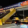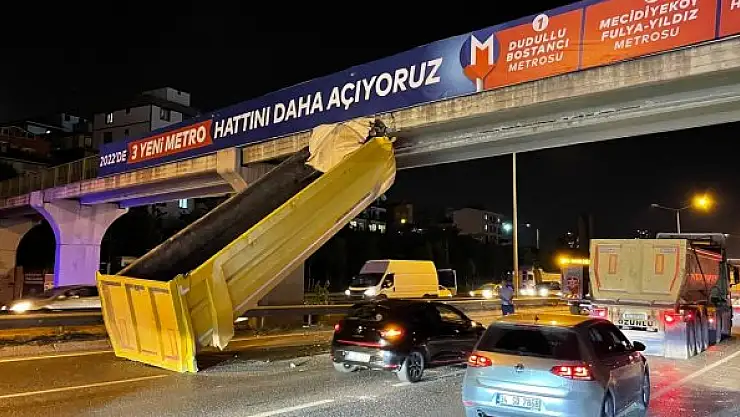 İstanbul'da hafriyat kamyonunun açılan dorsesi üst geçide takılı kaldı