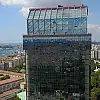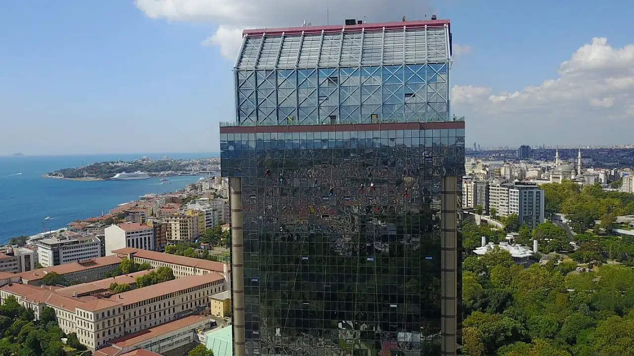 ŞİŞLİ'de 153 metre yüksekliği olan gökdelenin camlarını temizleyen iple erişim teknisyenlerinin cesaret isteyen çalışması drone ile görüntülendi.
