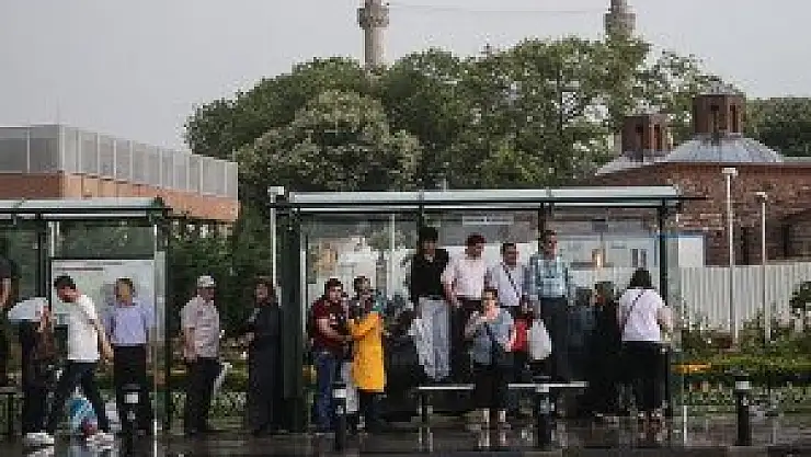 Kentte öğle saatlerinde başlayan sağanak, hayatı olumsuz etkiledi. Yağmura hazırlıksız yakalanan vatandaşlar, ıslanmamak için otobüs durakları, çevredeki binalar ve iş yerlerine sığındı.