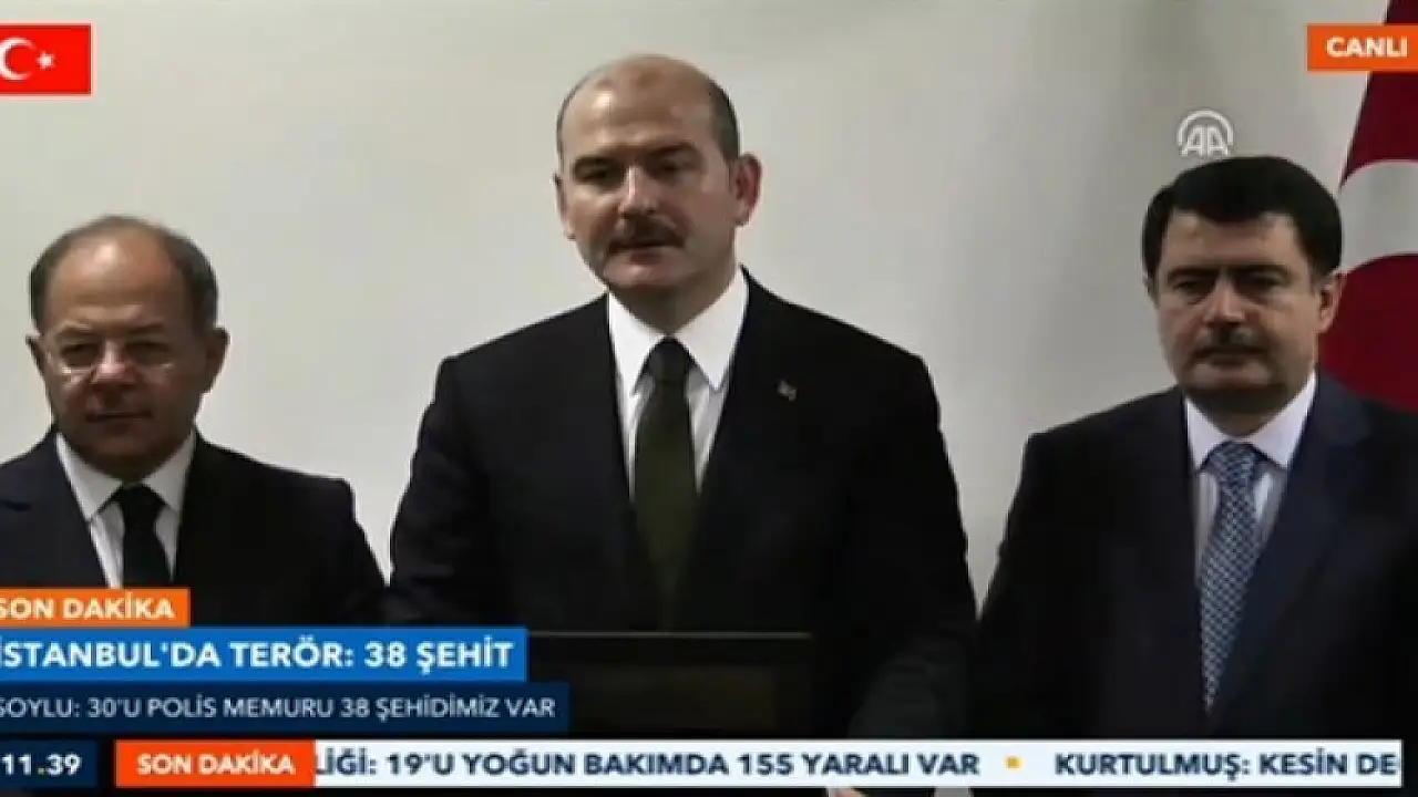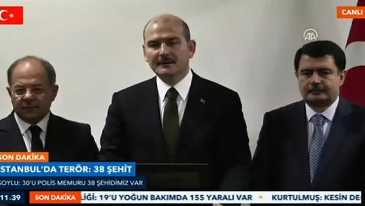 İçişleri Bakanı Süleyman Soylu, İstanbul'daki terör saldırısına ilişkin, "En son aldığımız bilgiler çerçevesinde dün akşamki menfur saldırıda şahadete erişmiş vatan evlatlarımız 38 oldu. Bunların 30'u polis memuru ve emniyet görevlisi, 7'si sivil vatandaşımız, birinin ise kimliği henüz tespit edilemedi." dedi.