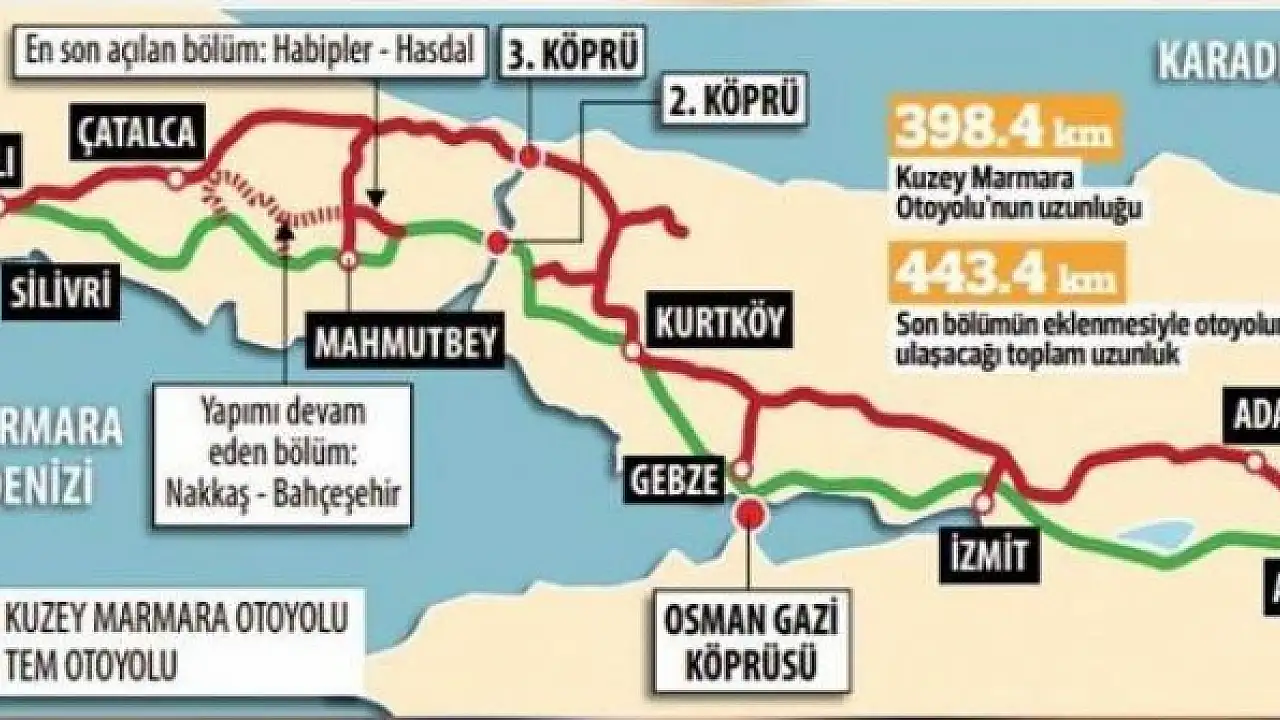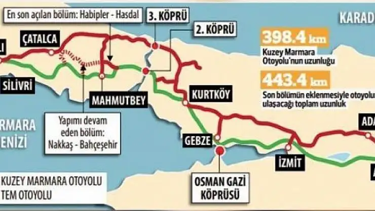 İstanbul'u kuzeyden by-pass ederek Trakya ile Anadolu arasında taşımacılık yapan büyük araçları şehir trafiğine sokmayacak Kuzey Marmara Otoyolu'nun 398.4 kilometrelik bölümü tamamlandı.