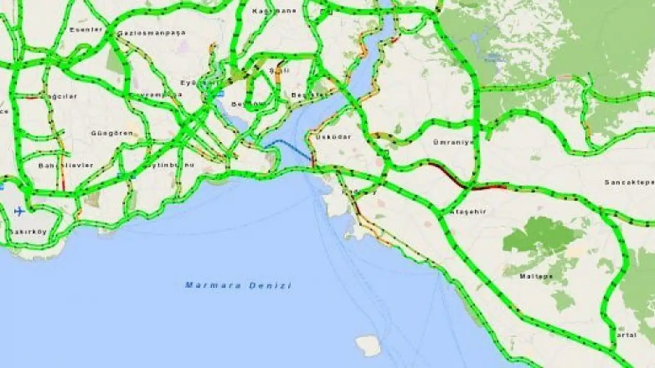 İstanbul Büyükşehir Belediyesi'nin (İBB) yoğunluk haritasında, şehrin genelinde trafik yeşil renkli gösterilirken, İstanbul'dan çıkış noktalarında oluşan yoğunluk nedeniyle renk kırmızıya döndü.