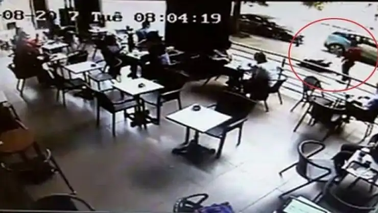 Görüntülerde kadının bir arkadaşıyla arkasına bakarak hızla ilerlediği görülüyor. Bu sırada hızla gelen erkek şahsın kadına yumruk attığı görülüyor. Kadın aldığı darbenin etkisiyle yere düşerken hızını alamayan şahsın yerdeki kadını tekmelediği görülüyor. Bu sırada kadının arkadaşı ve kafede oturanların koşarak şahsa engel olmaya çalıştıkları görülüyor.