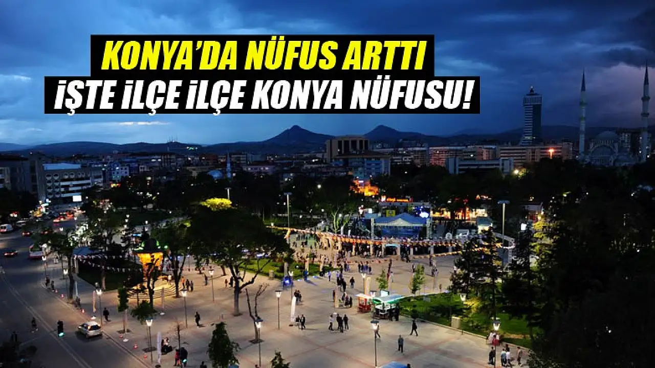 2017 yılında Konya’nın toplam nüfusu 2016 yılı nüfusuna göre 18 bin 846 kişi artmıştır. Konya’da; 10 ilçenin toplam nüfusları bir önceki yıla göre artarken, diğer ilçelerin nüfusları azalmıştır. Nüfus artış hızı en fazla olan ilçeler sırasıyla, Selçuklu (binde 26,3), Karatay (binde 22,3), Yalıhüyük (binde 15,8) iken; Merkez ilçelerden Meram’ın nüfus artış hızı binde -1,6 oldu. Nüfus artış hızı en düşük olan ilçeler ise Akören (binde -64,5), Taşkent (binde -42,6) ve Hadim (binde -41,4) oldu.