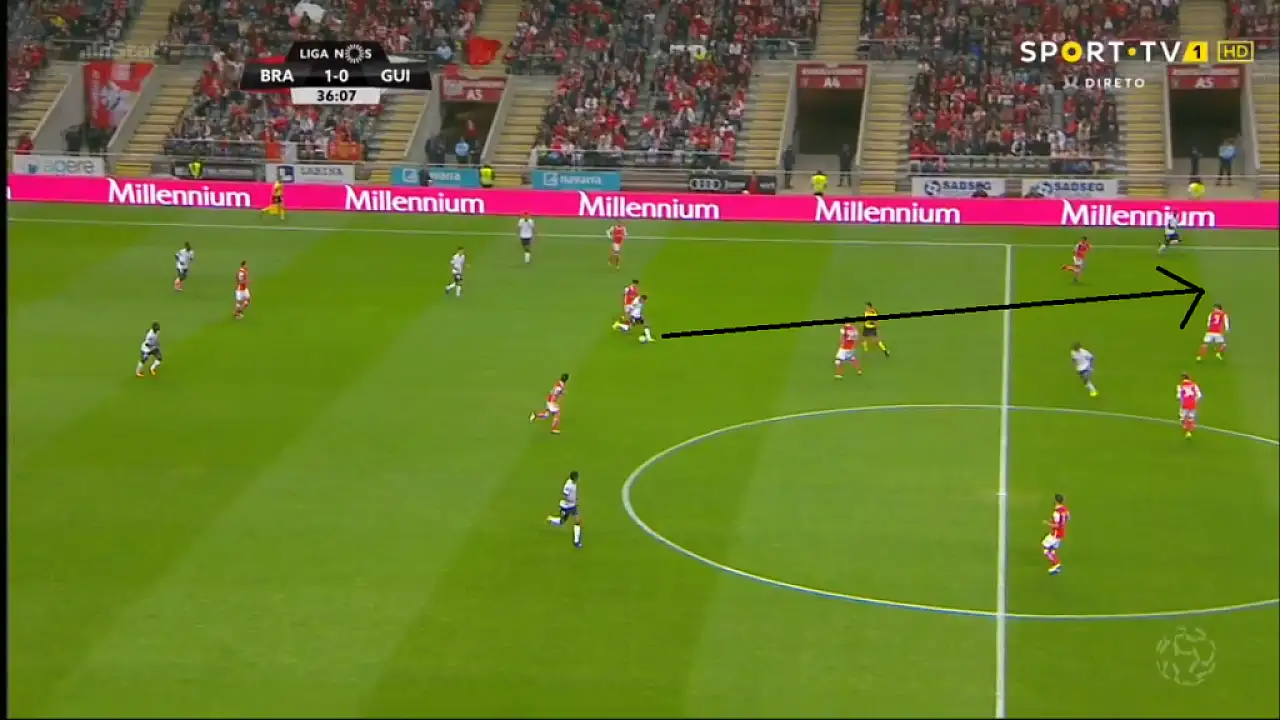 Guimaraes hücumlarında Hurtado – Raphinha ikilisinin rolü büyük. Hurtado’nun pasıyla savunma arkasına hareketlenen Raphinha golü atıyor ve takımına beraberliği getiriyor.
