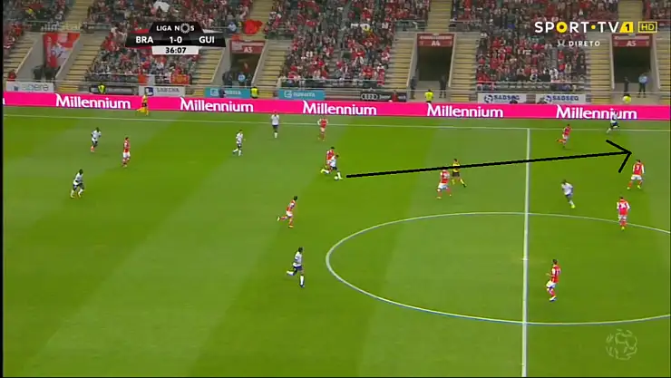 Konan’ın yaptığı pozisyon alma hataları, Guimaraes’in en büyük savunma zafiyetlerinden biri. Görselde arkadan gelen oyuncuyu farkedemeyip kafa vuruşu yapmasına müsaade ediyor ve bunun sonucunda Guimaraes geriye düşüyor.
