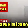 Bu kapsamda Türkiye'de hava kirliliğinin en yüksek olduğu 20 bölge sırasıyla şöyle; İskenderun (Hatay), Kadıköy-Göztepe (İstanbul), Iğdır Merkez, Osmaniye Merkez, Elbistan (Kahramanmaraş), Kadirli (Osmaniye), Karatay (Konya), Nazilli (Aydın), Nilüfer (Bursa), Kestel (Bursa), Merkez Ulupark (Manisa), Akdeniz-İstiklal (Mersin), Muş Merkez, Şahinbey-Beydilli (Gaziantep), Hakkari Merkez, Aydın Merkez, Batman Merkez, Şahinbey-GaskiD6 (Gaziantep), Denizli Merkez.
