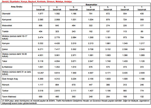 Açıklamaya göre, otomobilde azami primler basamaklarına göre İstanbul için 470 lirayla 2 bin 139 lira arasında, İzmir, Yalova, Erzurum ve Kayseri için 444 lirayla 2 bin 18 lira arasında, Kocaeli, Ankara, Bursa için 457 lirayla 2 bin 78 lira arasında, Sakarya, Düzce, Eskişehir, Ordu, Trabzon, Tekirdağ, Bingöl, Rize, Adana, Samsun, Karabük için 439 lirayla bin 997 lira arasında, Konya, Denizli, Diyarbakır, Bayburt, Kırıkkale, Giresun, Malatya, Antalya için 435 lirayla bin 977 lira arasında, Erzincan, İçel, Gaziantep, Elazığ, Zonguldak, Sivas, Bolu, Siirt, Aksaray, Çorum, Muş, Batman, Bilecik, Bitlis, Kırşehir, Iğdır, Gümüşhane, Artvin için 431 lirayla bin 957 lira arasında, Niğde, Nevşehir, Kahramanmaraş, Çankırı, Kırklareli, Uşak, Van, Yozgat, Bartın, Karaman, Balıkesir, Edirne, Afyon, Şırnak, Amasya, Ağrı, Manisa için 426 lirayla bin 937 lira arasında, Aydın, Tokat, Sinop, Isparta, Tunceli, Çanakkale, Mardin, Hatay, Osmaniye, Kütahya, Muğla, Kars, Kastamonu, Burdur, Adıyaman, Şanlıurfa, Ardahan, Hakkari, Kilis için 422 lirayla bin 917 lira arasında değişiyor.