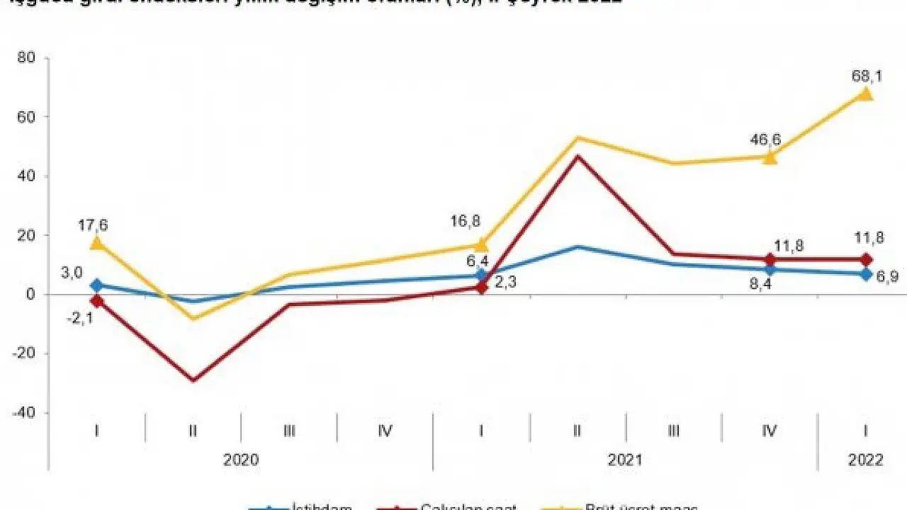 Brüt ücret-maaş endeksi, geçen yılın aynı çeyreğine göre yüzde 68,1 arttı. Alt sektörler incelendiğinde, endeks; sanayi sektöründe yüzde 63,3, inşaat sektöründe yüzde 53,5 ve ticaret-hizmet sektörlerinde yüzde 73,8 arttı.
