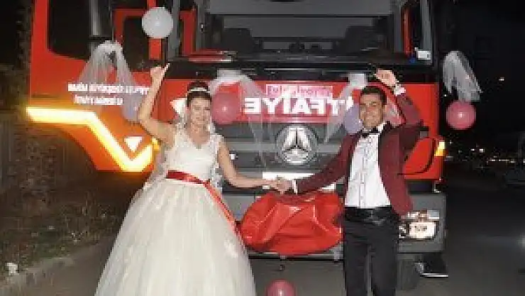 Manisa Büyükşehir Belediyesi Turgutlu İtfaiye Amirliğinde görevli Murat Yılmaz (28), itfaiye aracını gelin arabası yaptı. İtfaiye aracını süsleyen Murat Yılmaz ve Cennet Kılıç (23) çifti, kendisine eşlik eden diğer araçlarla konvoy halinde ilçenin cadde ve sokaklarından geçti. Bu araçla düğün salonuna gelen çifti, mesai arkadaşları yalnız bırakmadı. Gelin arabası düğün salonundaki davetlilerin de ilgisini çekti.