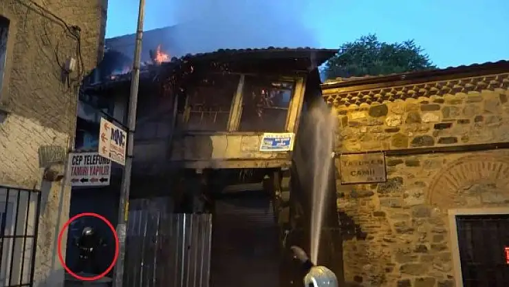 Bursa'da hanlar bölgesinde bulunan yüzlerce yıllık tarihi bina, yanarak yıkıldı. İtfaiye eri ise yanarak yıkılan binanın altında kalmaktan son anda kurtuldu. O anlar kameralara saniye saniye yansıdı.